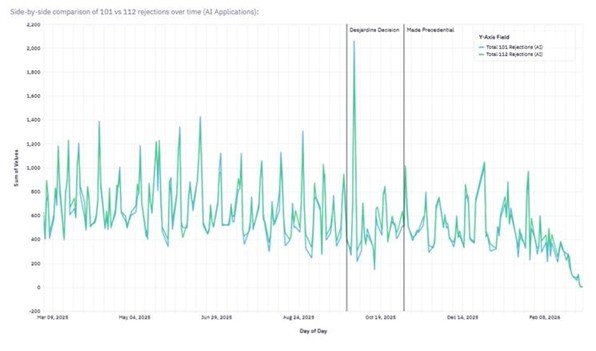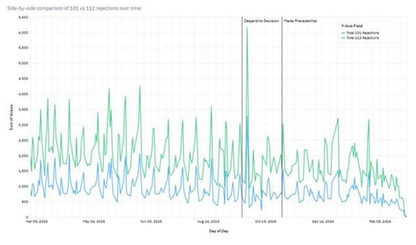 Since Ex parte DesJardins was made precedential on November 4, 2025, the data reflected in the charts below suggests that written description rejections under § 112 have increased relative to § 101 rejections. The two sets of graphs below cover the period from March 2025 through March 2026 and compare § 101 and § 112 rejection activity both across all applications and across a filtered subset of AI-related applications. Although temporal correlation alone does not prove causation, the timing is notable. DesJardins expressly redirected examination toward §§ 102, 103, and 112, and the post-November 2025 trendlines are consistent with that policy signal.