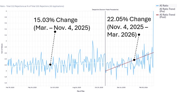 Figure 2 (below) illustrates the ratio of total § 112 rejections as a percentage of total § 101 rejections for all applications. Before the precedential designation, the chart shows a pre-November 4, 2025 trendline at 0.1503, i.e., 15.03%. After the precedential designation, the post-November 4, 2025 trendline rises to 0.2205, i.e., 22.05%.