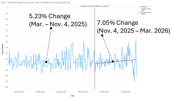 Figure 4 presents the ratio of total § 112 rejections as a percentage of total § 101 rejections for the AI subset. Before the precedential designation, the chart shows a trendline at 0.0523, or 5.23%. After November 4, 2025, the trendline rises to 0.0705, or 7.05%.